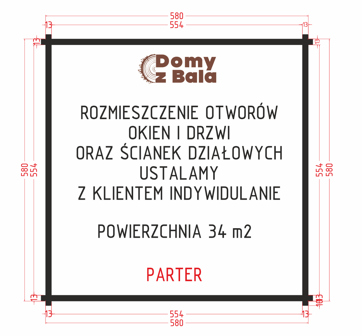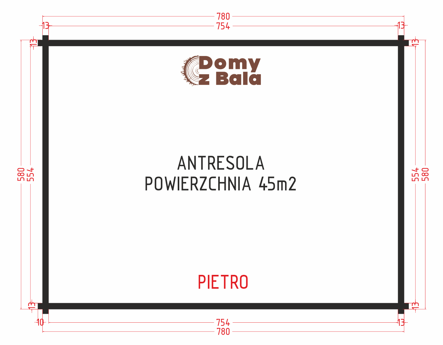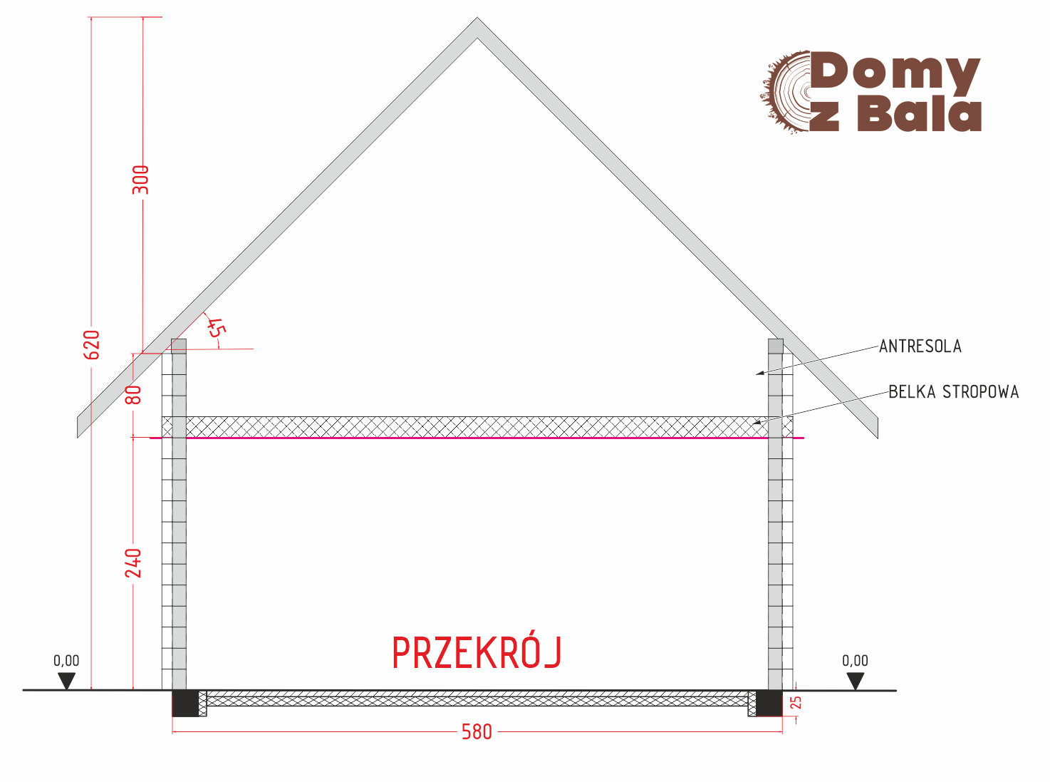 Wymiar zewnętrzny przyziemia 580 x 580 cm – 34 m2, poddasz (antresola) 580 x 780 cm – 45 m2  Domek na zgłoszenie